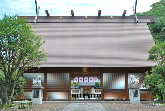 参道を上がりきったところにある拝殿を、鮮雲殿といいます。 この拝殿は千木までの高さ約17メートル、間口15メートル、 奥行き10メートルの大社殿で、四方の景観が見えるよ うに、吹き抜けの設計になっています。 また、拝殿の正面入 り口には「大成宮」の額が掲げられており、 この額の材は樹 齢200年のアララギの木を使用しています。
